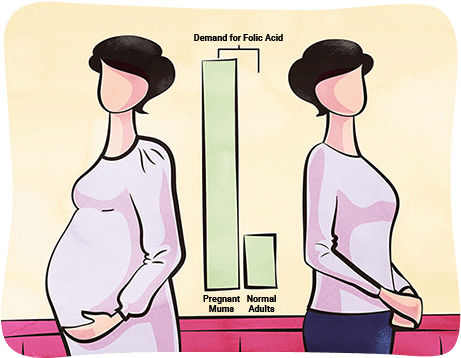 Folic acid helps with the growth and development of the foetus and plays an important role in formation of red blood cells. As compared to normal adults, the need of folic acids in pregnant mums is higher.