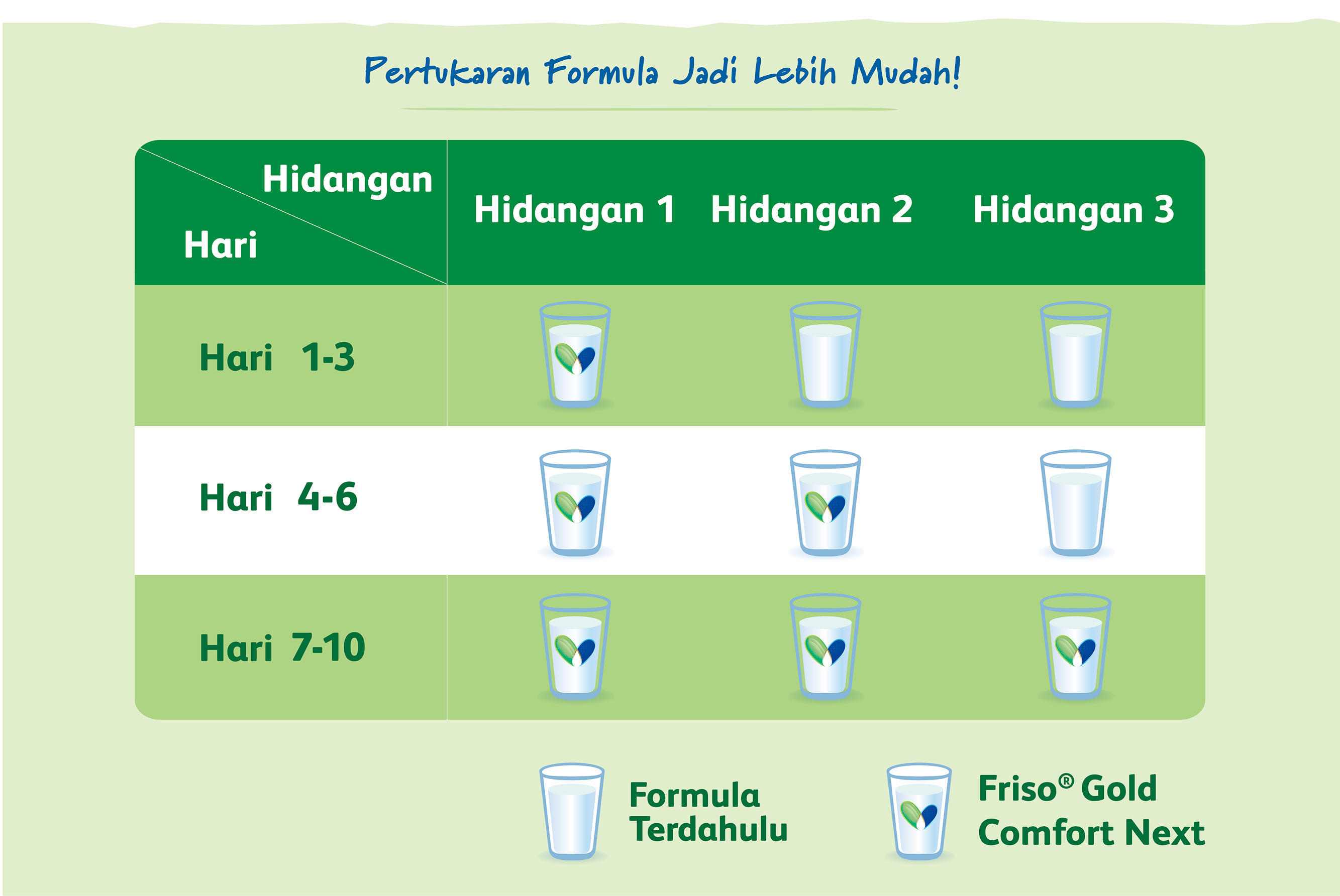 Apabila anda telah memilih susu formula baharu untuk anak anda, lakukan peralihan secara beransur-ansur dalam tempoh satu hingga dua minggu. Jadual di bawah menunjukkan panduan ringkas tentang cara menukar daripada susu formula semasa kepada Friso® Gold Comfort Next: